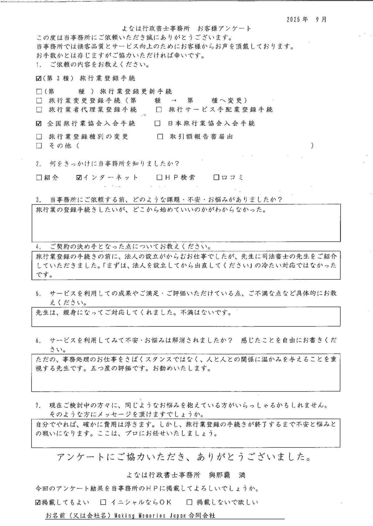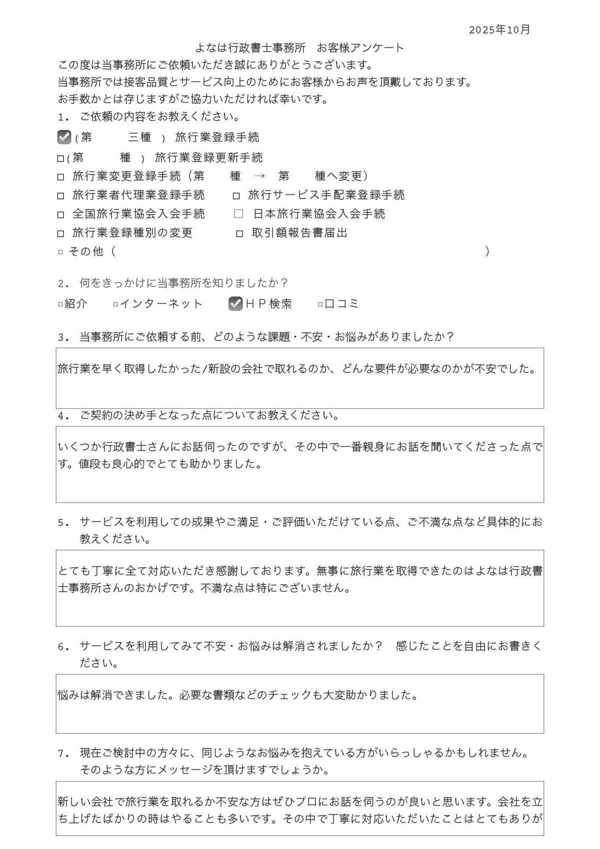 → とても丁寧に対応いただき感謝しております。無事に旅行業を取得できたのはよなは行政書士事務所さんのおかげです。不満な点は特にございません。